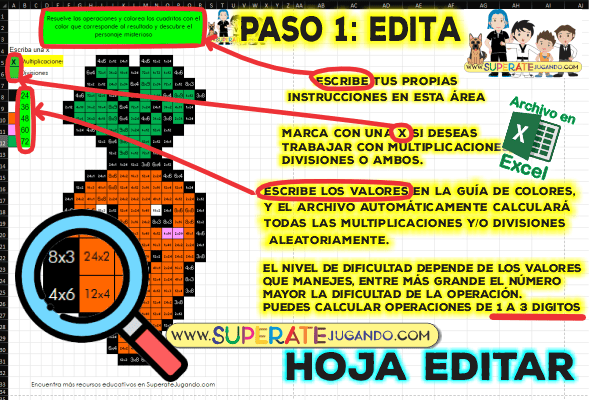 Tú asignas valores en la guía de colores. El archivo genera de forma automática multiplicaciones y divisiones para cada casilla del dibujo. Usa números pequeños para retos fáciles, o valores grandes para operaciones más avanzadas (hasta 2–3 dígitos).