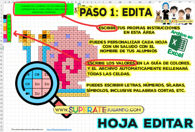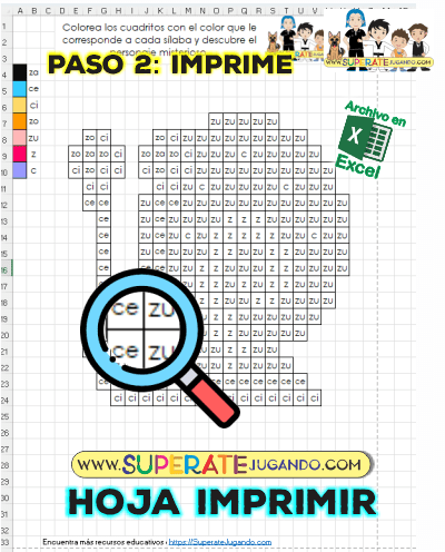 Este recurso no es un juego digital. El archivo Excel lo usa únicamente el docente para generar e imprimir las hojas de trabajo. Los alumnos no usan computadora: trabajan en papel, coloreando y resolviendo como en cualquier ficha.